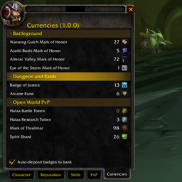 这是一个简单的插件,它在角色菜单中添加了一个类似巫妖王之怒的货币标签页,用于追踪各种徽章。此外,它还有一个选项,可以在打开银行时自动将徽章转移到银行中。